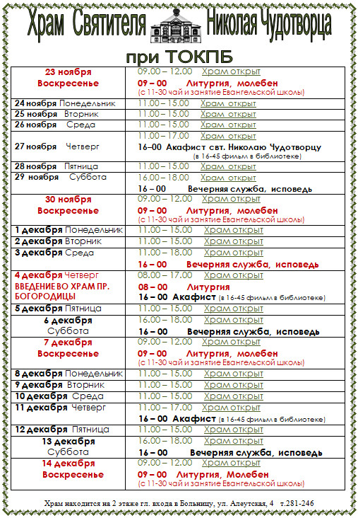Храмовый праздник: день памяти Свт. Николая Чудотворца – 9 / 22 мая, 6 / 19 декабря